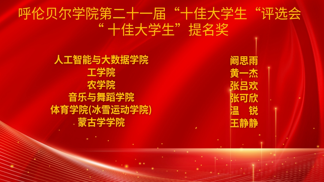 经评审,最终评定呼伦贝尔学院第二十一届“十佳大学生”10名、“十佳大学生”提名奖6名。
