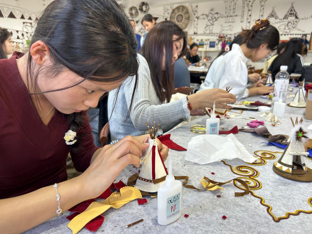 本次实践课程特别邀请自治区级非遗传承人艾吉玛主讲,她以鄂温克族历史文化为切入点,系统梳理了鄂温克族非遗技艺的起源、发展及核心传承脉络,为学生搭建起“文化认知+技艺学习”的基础框架。课程采用“实操实训”模式,艾吉玛及工作室成员演示“太阳花”皮毛拼贴工艺与“撮罗子”传统搭建技艺。学生参与从选材、剪裁到成型全过程,体验“太阳花”饰品制作中的貂毛捻线、驯鹿皮裁剪等20余道工序,以及“撮罗子”桦木框架搭建、桦树皮苫盖等技艺,打破“纸上谈非遗”局限,通过动手操作理解文化基因。艾吉玛结合创业经历介绍“非遗+文创+旅游”产业化模式,鼓励青年融合传统技艺与现代设计。她强调,非遗传承需扎根青年群体,培养懂技艺、善创新的传承人。这种“产学研”融合模式,有助于构建“课堂-工坊-市场”全链条培养体系,为学生提供全面学习体验。