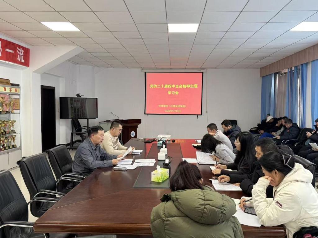 为深入学习贯彻党的二十届四中全会精神,精准对接国家“十五五”规划战略部署,系统谋划学院未来发展蓝图,12月3日下午,体育学院(冰雪运动学院)组织全体教职工召开专题政治理论学习会,深入学习党的二十届四中全会精神。学习会由学院党委书记胡日查毕力格主持,学院班子成员及全体教职工参加学习会。
