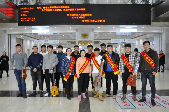 快闪活动之后,音乐与舞蹈学院与海拉尔区义工联合会、呼伦贝尔市医院联合举办学雷锋日大型志愿活动,呼院志愿者协助呼伦贝尔市医院开展义诊和咨询服务活动。呼伦贝尔学院音乐与舞蹈学院志愿者们分赴门诊病房、住院病房和医护办公室,带着精心组织的多个文艺节目,用文艺演出的形式宣传爱国主义和社会主义核心价值观,得到群众喜爱和热烈欢迎;大学生志愿者们每天在门诊大厅进行钢琴演奏活动已经开展近一年,被广大群众熟知获得好评;早春三月,呼伦贝尔学院师生用实际行动积极践行雷锋精神!