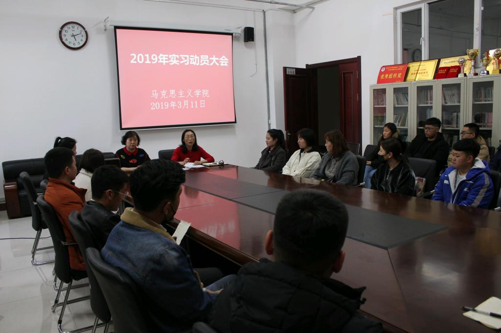马克思主义学院于3月11日在崇文楼会议室召开2019年毕业实习动员大会。马克思主义学院院长褚金芬、副院长毛欣欣、金钢主任、毕业班班主任、全体集中实习学生参加了本次会议。