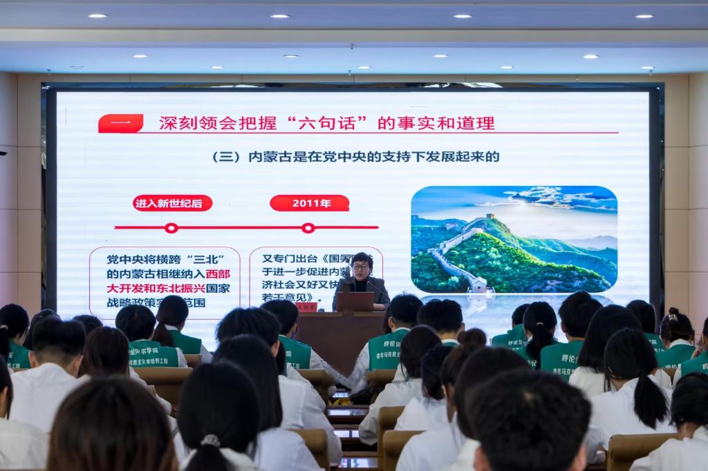 王晓芳围绕“六句话”的事实和道理,结合内蒙古自治区发展过程中各时期的历史事件、历史人物以及本地区的发展历程,并通过视频播放,全面系统、形象生动地对“六句话”进行了解读,让参会学生在深刻理解“六句话”的事实与道理内涵的基础上,明白了这“六句话”是对党在内蒙古地区历史作为的客观总结,进一步增强了学生们时刻不忘感党恩、矢志不渝听党话、坚定不移跟党走的信念。