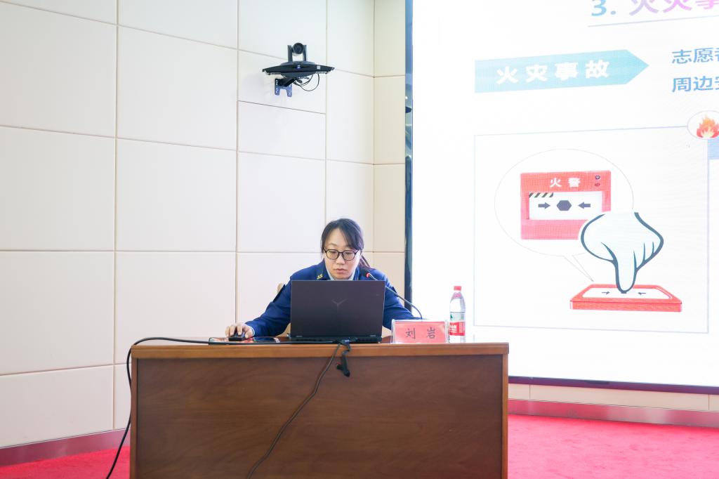 培训会上,刘岩从冰雪季事故灾难事件、社会安全事件与消防宣传教育等三个方面展开培训。通过现实案例,对交通意外、触电事故、火灾事故以及冰域救援技术及防冻伤常识进行了专业的讲解。同时,她针对灭火器使用方法、冰域事故自救方法、开展救援方法等方面,对志愿者进行细致的指导。