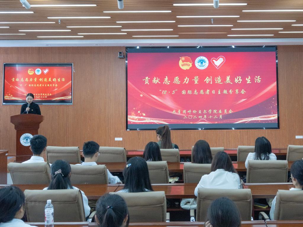 在第39个国际志愿者日来临之际,为深入学习贯彻习近平总书记关于志愿服务的重要论述和系列重要指示批示精神,进一步弘扬“奉献、友爱、互助、进步”的志愿精神,培育和践行社会主义核心价值观,奋力开创新时代志愿服务新局面,12月4日下午,呼伦贝尔学院“贡献志愿力量 创造美好生活”——“12·5”国际志愿者日主题分享会在崇文楼A501会议室举行,来自各学院的青年志愿者代表共60余人参加了活动。活动由校团委素质拓展部部长王巍主持。